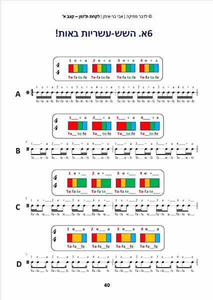 5. לקחת ת'זמן - קצב א'  הספר משלב שיטות שונות ללמידת ולהפנמת הקצב. תרגול פשוט ויומיומי של כמה דקות יאפשר לכם שליטה מוחלטת ביסודות הקריאה הריתמית.